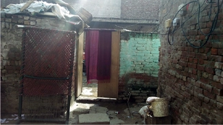 Which has no roof, the bed is stood up during the day to create space and the family’s toilet is a drain upon which a bucket is placed for the collection of water.