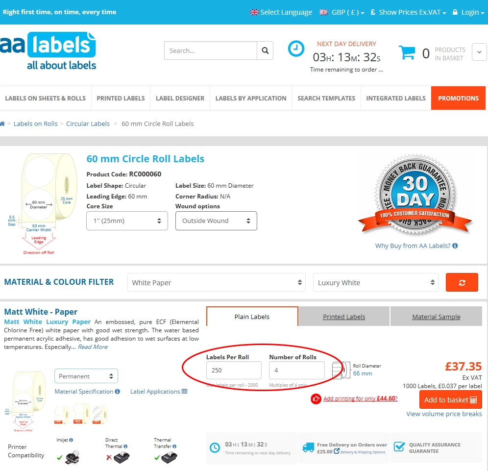 Vous pouvez ensuite utiliser le filtre d'étiquettes montré plus haut pour choisir la forme et la taille de l'étiquette et procéder comme décrit précédemment pour sélectionner le matériau, la quantité d'étiquettes et le nombre de rouleaux.
